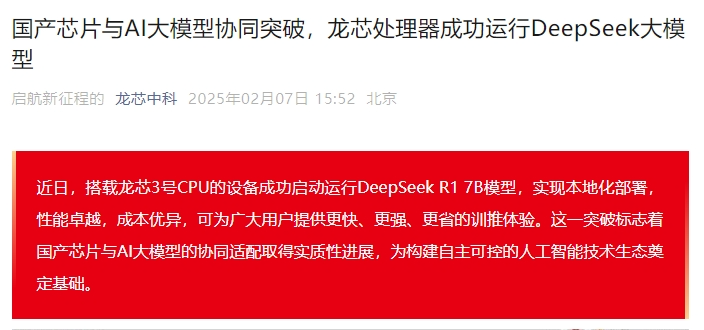 2月7日,国产CPU芯片厂商龙芯中科宣布,龙芯处理器成功运行DeepSeek大模型。